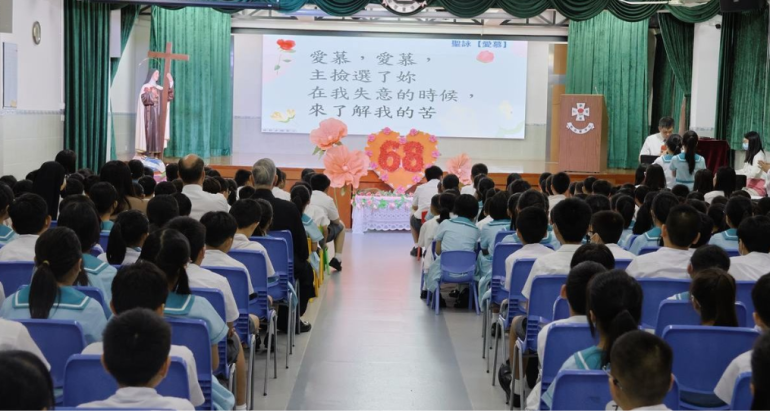 68载耕耘不息,天主教澳门教区圣德兰学校以圣女小德兰为主保,于其瞻礼日前一天,举行创校68周年校庆。校监刘炎新神父、校牧夏子明神父、多位校董与全体师生齐聚一堂,共同参与校庆祈祷会。