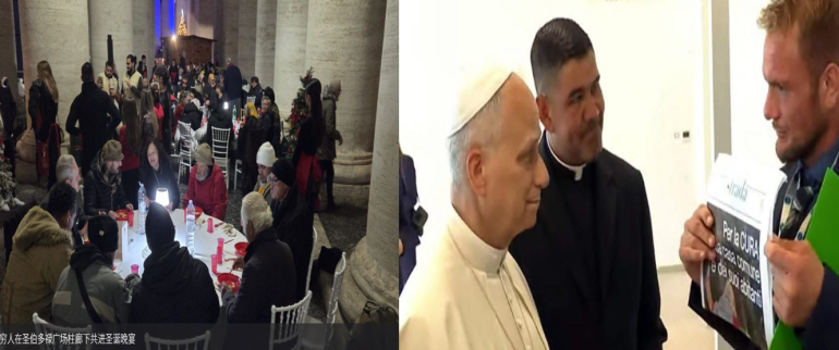 12月7日晚,大约有120位平时生活在梵蒂冈附近的穷人和无家可归者受邀在圣伯多禄广场柱廊下共进圣诞晚宴。这项活动由圣伯多禄堂区和教宗赈济所共同筹办,并得到梵蒂冈城国政府和圣座传播部的支持。