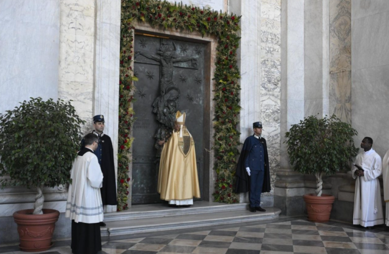 12 月 27 日星期六上午,枢机主教的祈祷声在圣殿的中庭回荡,他主持了圣殿圣门的庄严关闭仪式。枢机主教默默地走上台阶,然后在门槛上跪下祈祷,之后起身关上圣门,同时低头表示敬意。许多信友随后走到门槛前,将手放在上面,以示祈祷和默想。