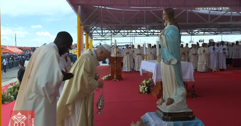 弥撒结束后,教宗乘飞机返回罗安达,在法蒂玛圣母堂会见了主教、神父、执事、献身男女会士以及牧灵工作者。鼓励他们在牧灵工作中尽心尽力,并向他们保证,天主深知他们以何等慷慨之心拥抱圣召。教宗说道:“你们出于对祂的爱,为了用福音真理滋养你们的信友,所做的一切,祂都看在眼里。”