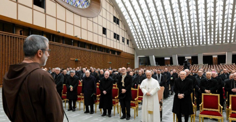 教宗府讲道神师帕索里尼神父在保禄六世大厅主持四旬期默想,主题为“谁若在基督内,他就是一个新受造物(格后五17)。在圣方济各思想中的归依福音”。