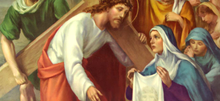 苦路上,有一个妇人,名叫物罗尼加。她看见耶稣满面汗水和血污,背着十字架蹒跚前行。她做不了什么,不能替他背负十字架,不能为他说一句辩护的话,甚至不能阻挡士兵的鞭打。她只能走上前,用自己的头巾,轻轻为祂抹去脸上的汗与血。这是一个简单的动作。但当她收回头巾时,却发现那上面印下了耶稣的面容!那份苦难、那份温柔、那份爱,从此留在这块布上,也留在她心里。