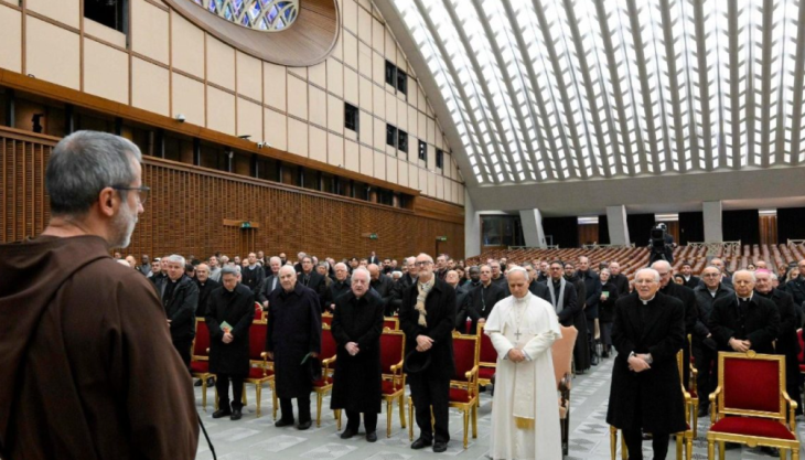 公教新闻 四旬期默想:圣方济各归依福音(3/6/2026) 教宗府讲道神师帕索里尼神父在保禄六世大厅主持四旬期默想,主题为“谁若在基督内,他就是一个新受造物(格后五17)。在圣方济各思想中的归依福音”。