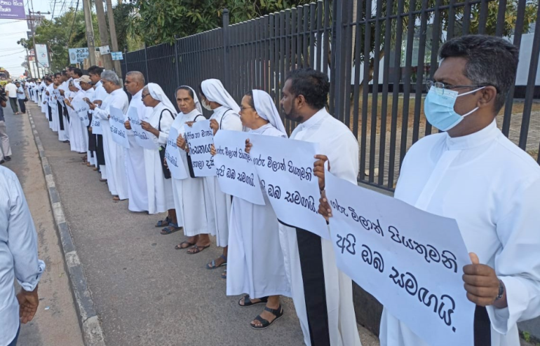 抗议当天上午,科伦坡总教区尼甘布地区的神职人员和修女们聚集在科伦坡-普塔拉马公路旁的市政厅大楼前。这场静默示威持续了约一个小时。参与者们一边诵念玫瑰经,一边举着写有“我们谴责身心虐待”和“米兰神父,我们与您同在”的标语牌。