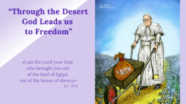 壹明头条 【壹明头条】| 艺术家笔下的教宗绘画传达了其四旬期的讯息 海报围绕着“天主引导我们穿过沙漠走向自由”这一主题信息设计,海报上,方济各推着一辆装满标有“信仰”的袋子的手推车,沿着一条布满钉子的沙漠小路行走。